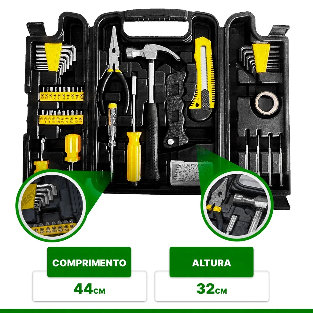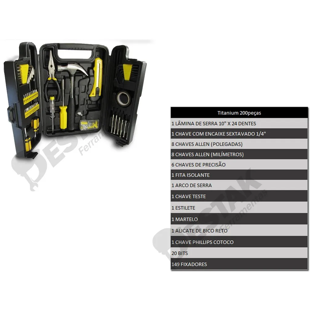 Em suas 200 peças, você vai encontrar equipamentos muito usados em diversas áreas, seja você eletricista, mecânico, pedreiro, marceneiro, pedreiro, técnico ou aspirante.